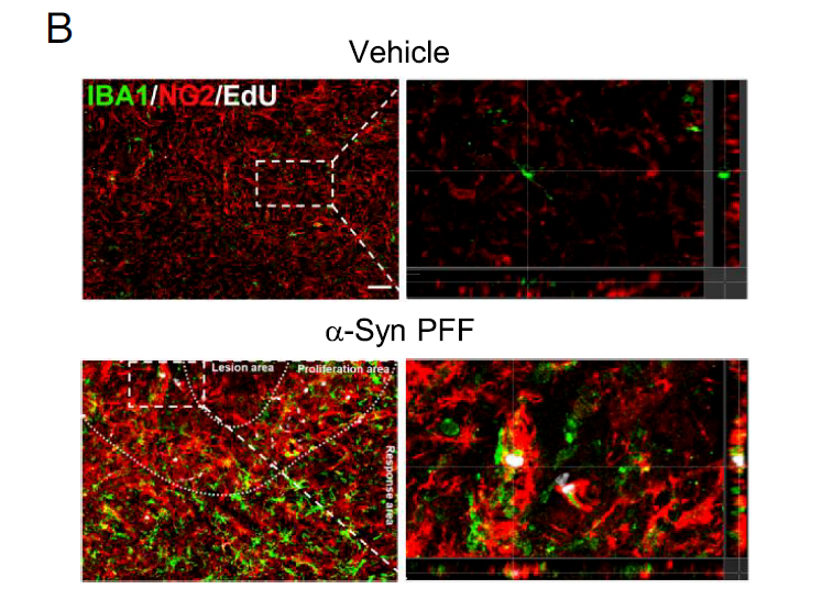 在中枢神经系统中,Cspg4主要表达在少突胶质细胞前体细胞。然而,报道表达Cspg4的小胶质细胞的文献资料较少,仅有涉及急性脑损伤模型的个案介绍,这群细胞的作用更不明确。为了探究Cspg4+小胶质细胞在神经退行性疾病发病过程中的作用,研究团队对多种不同类型的帕金森病动物模型进行病理学检查,观察到在这些模型中存在一群特殊的细胞——Cspg4+小胶质细胞。它们可以对病理性刺激做出响应,并启动细胞增殖过程。