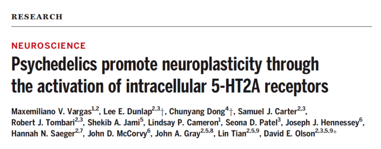 2023年2月16日,加州大学戴维 斯分校的 David E. Olson 教授团队在国际顶尖学术期刊 Science 上 发表了题为: Psychedelics promote neuroplasticity through the activation of intracellular 5-HT2A receptors (裸盖菇素通过激活细胞内5-HT2A受体来促进神经可塑性) 的研究论文。
