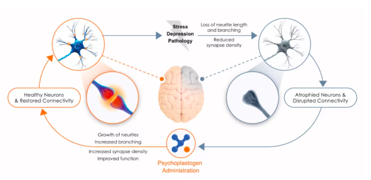 诸如麦角酸二乙胺 (LSD) ,MDMA和裸盖菇素等致幻剂显示出治疗以神经连接丧失为特征的广泛精神疾病的潜在前景。皮层树突棘密度下降是几种神经精神疾病的标志,而促进皮层神经元生长的能力,被认为可能是这些致幻类药物在治疗抑郁症中能够快速起效并持续发挥疗效的基础。